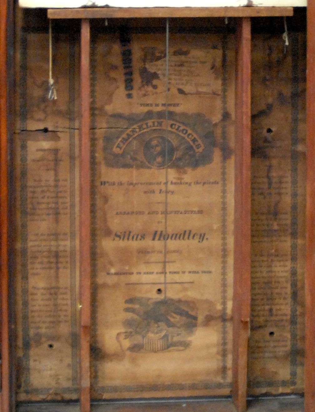 Label reads, “Time Is Money / Franklin Clocks / With The Improvement of Bushing The Pivots With Ivory / Arranged And Manufactured By / Silas Hoadley, / Plymouth, Conn.”, ca 1830. Complete paper label covers over half of the backboard. Bottom painted glass is original, some paint loss. The upper glass is original but has a break, the mirror is a very nice replacement. It has a good wood dial, correct hands, pair of iron weights, brass bob, and iron bell on top of the 30-hour upside down movement. I did not hang the weights to the wood movement but the previous owner had it running. 35. 5 inch high mahogany veneered case is not a cream puff, some veneer chips, but it is complete. Columns and splat have no stenciling but are nice clean polished mahogany. The door has an ivory escutcheon with key lock, but no key. $500-$700.