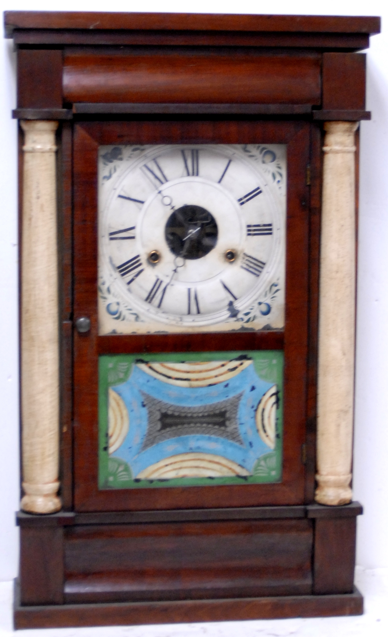 ‘Sperry & Shaw / 8 Courtland St. / New York / Clocks Repaired / All Kinds of Trimmings For Sale”, made this 30-hour OG clock, ca 1844. Early model OG. Everything is original but the glasses. The rosewood veneered case is 27” tall, and only has one door. This case is clean and polished and the veneer is very good for its age, maybe an edge tic or two, and it has the original door latch. Period wood dial with men on horses on the four corners and other war objects in the center. It has old hands and key. Inside is a nice label, a pair of period iron 30-hour weights, a coil gong for the hour strike, and the unsigned 8-day brass movement. $150-$300.