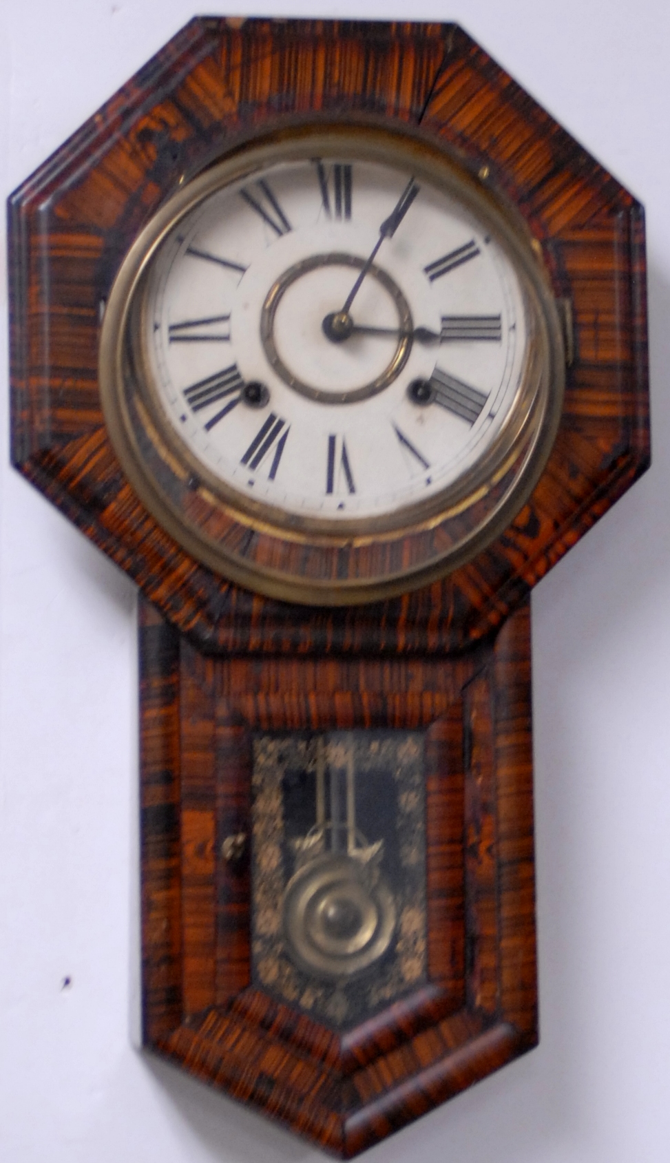 or markings. Did not pull the dial but the 8-day movement is running. It strikes a coil gong, has a nice brass pendulum, painted dial,