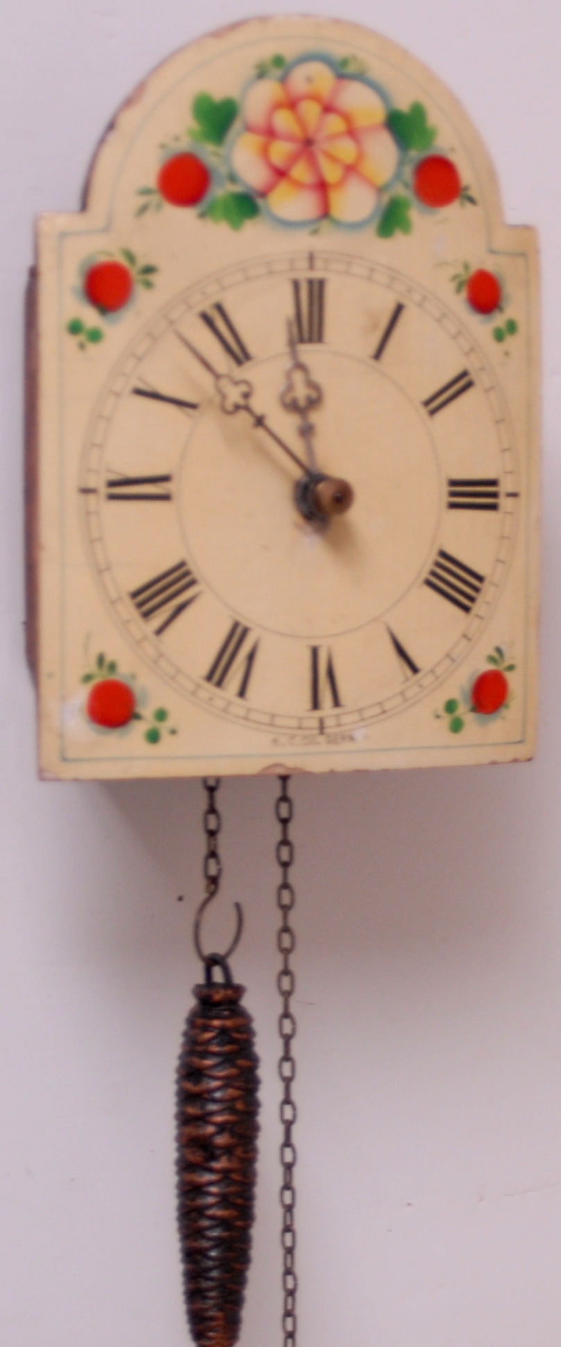 original, 10 inches tall. Hanging metal clock, 12 inches, porcelain dial with multiple lines and small chips. 8 day time only