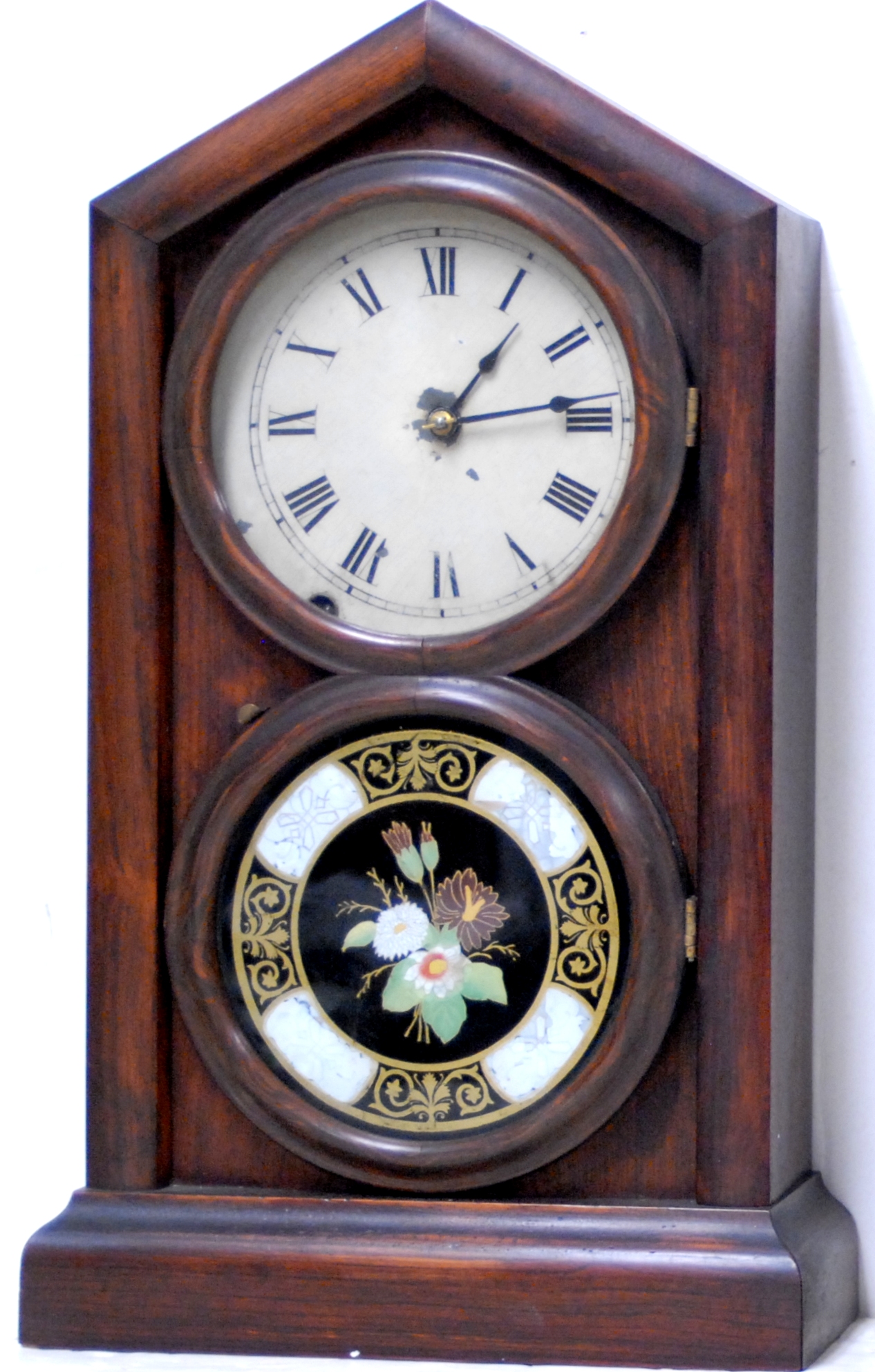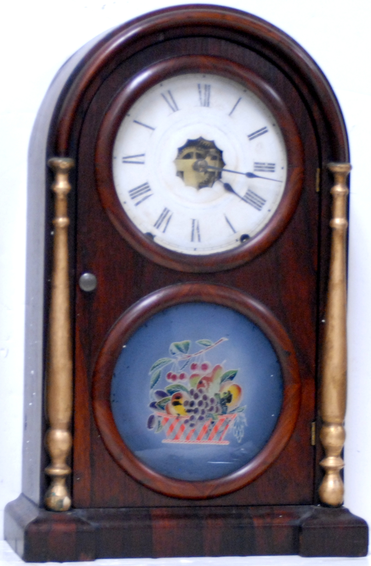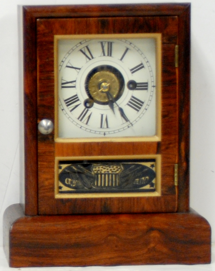 clock with a flat top and round base, ca 1865. The one day time and alarm movement in this case is their “C” movement. The door latch