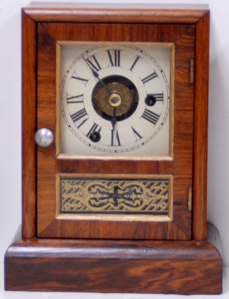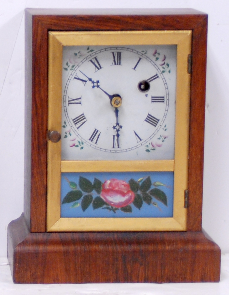 clock, ca 1865. This super nice 9 inch high case is made of rosewood veneer, gold around the glasses was enhanced. The door knob is