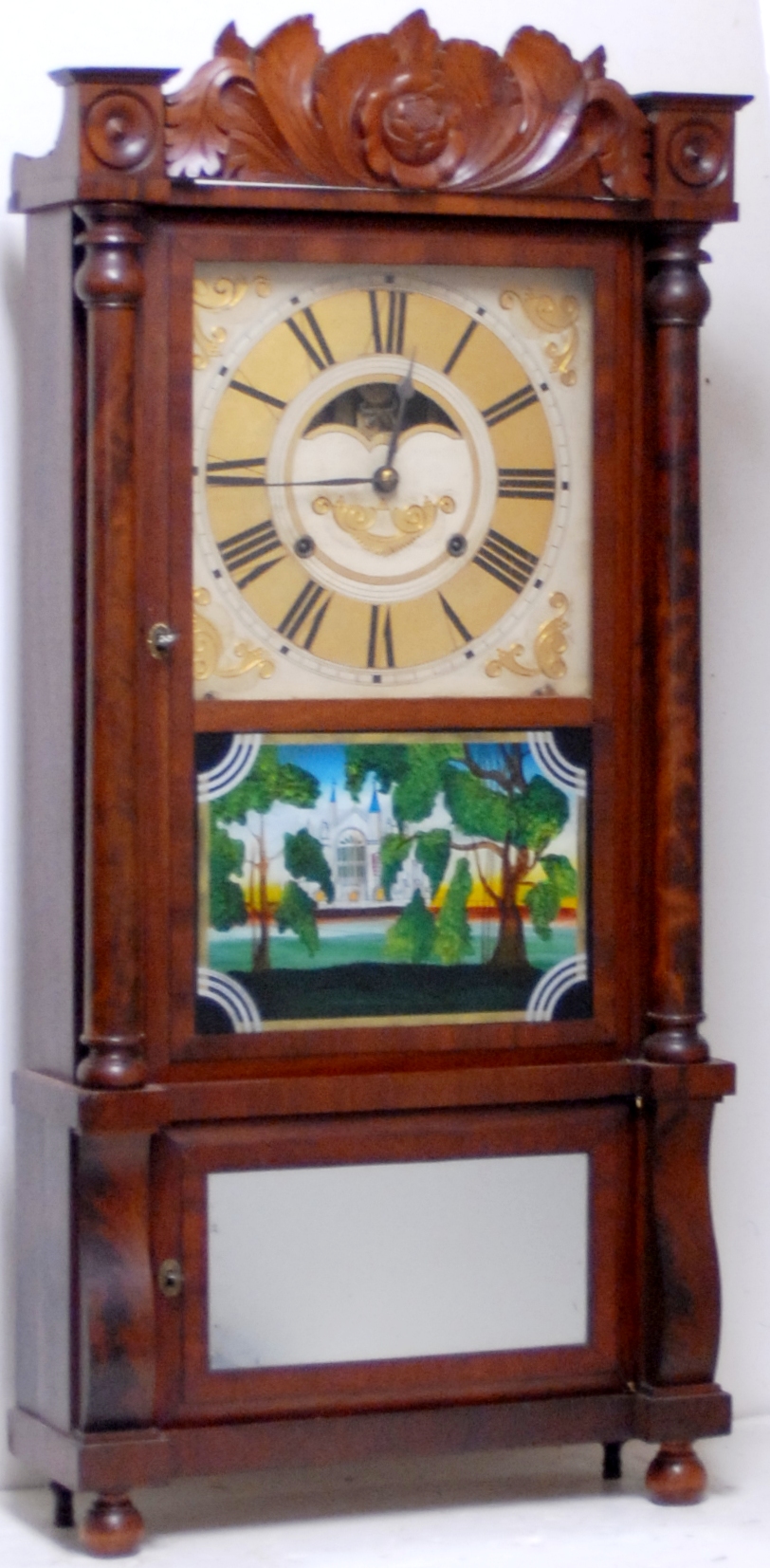 case with two doors, full columns, sleigh front base, and carved splat, ca 1840. It has an 8 day strap brass movement with side arm,