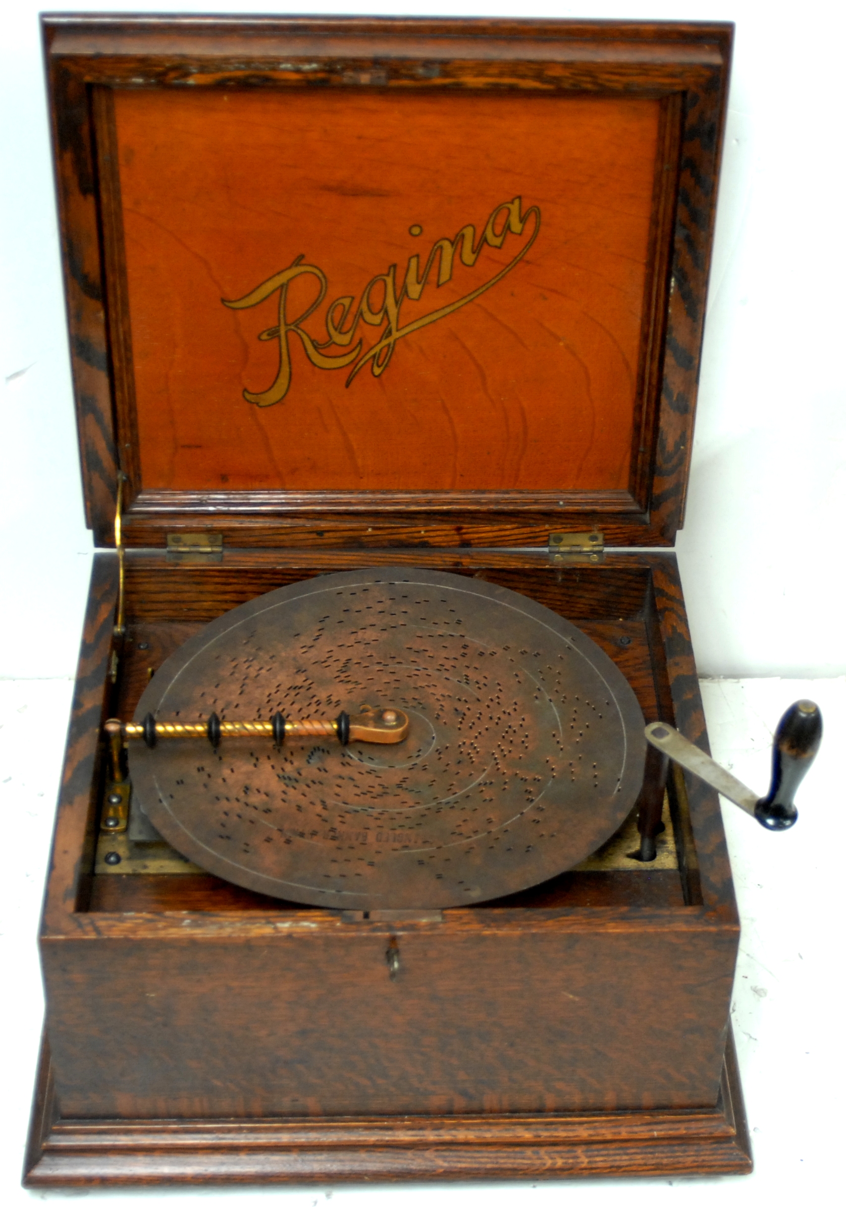and Repairing the Regina Music Boxes”. It has an old winding crank. New discs can be purchased from Porter Music Boxes, and old ones