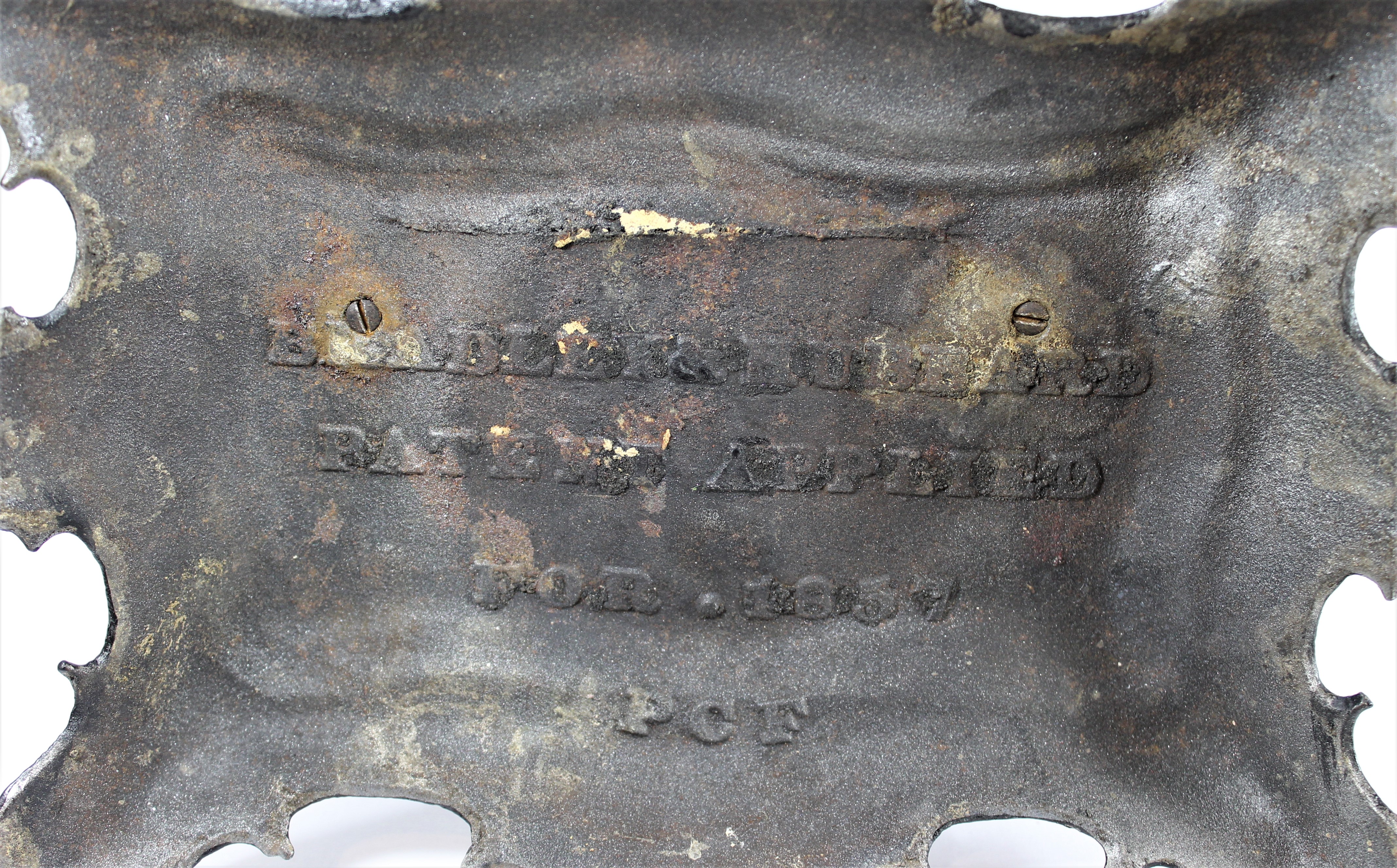 and rock up and down nicely with the movement. The glass in the bezel is old, the paper dial replaced, and the hands don’t match. This is a very early scalloped base, signed underneath “Bradley & Hubbard, Patent applied for 1857 PCF”. $300-$500.