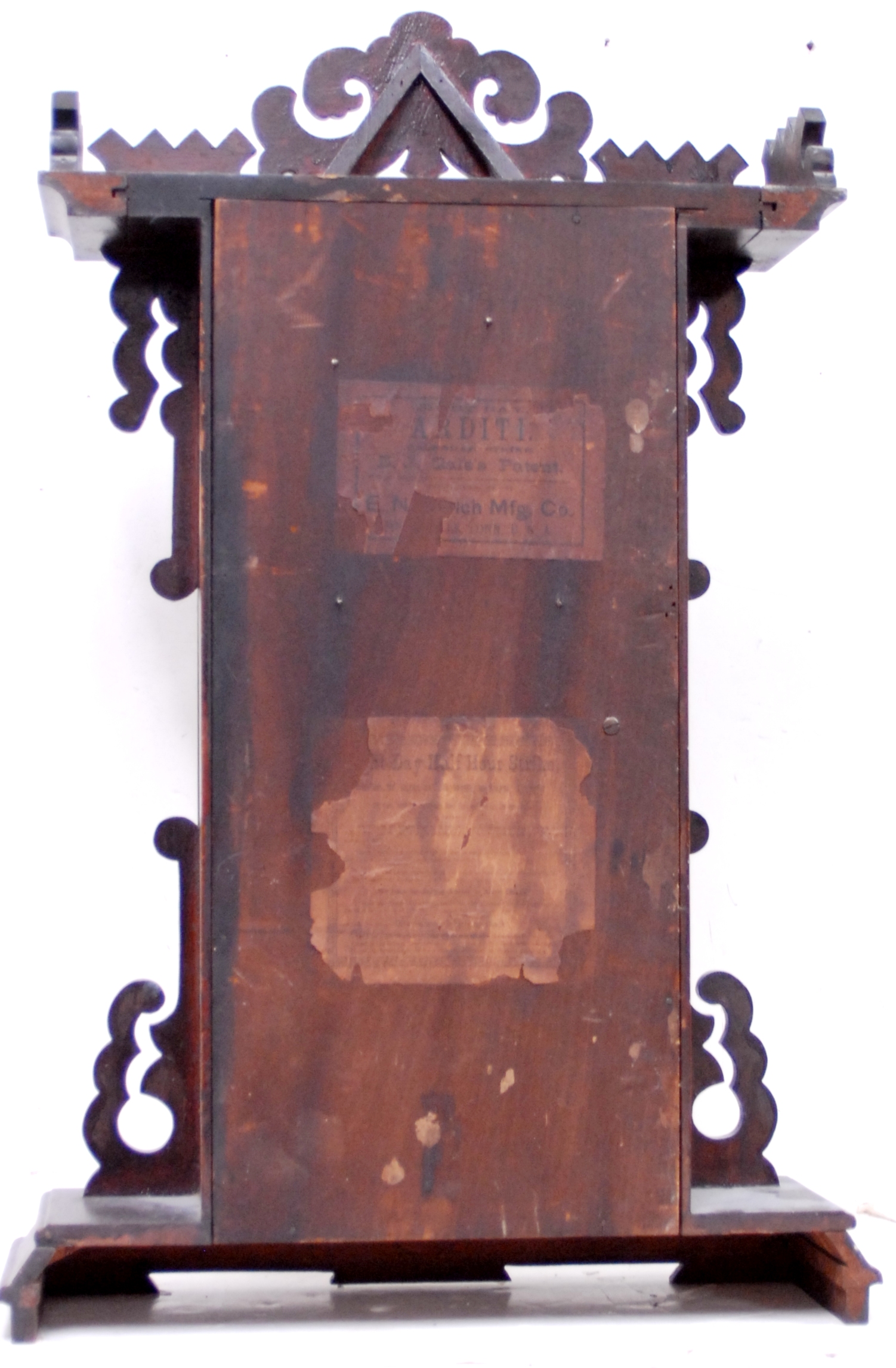 Welch, Spring & Co. shelf calendar clock, “Arditi”, ca 1885. One of the first calendar clocks this company made using the Gale patented calendar movement. Inside is a nice Gale label with operating instructions. That is the pendulum hanging on the calendar movement in the picture. I forgot to remove it, sorry. The Welch, Spring 8-day upper movement is signed by Welch, is running nicely and striking hours on a coil gong. There are no extra holes around the movements or dial pans. Walnut case is 27” high, there has been no attempt to clean it and it is very dark and crusty, but looks good. There is no case damage or repairs evident. The case design is very nice but void of any applied or carved pieces, just some good jigsaw work and grooved designs over the top and side ornaments. The glass is original, so are both dials and hands. Everything else is old and original. Ly-Welch, page 62. $300-$500.