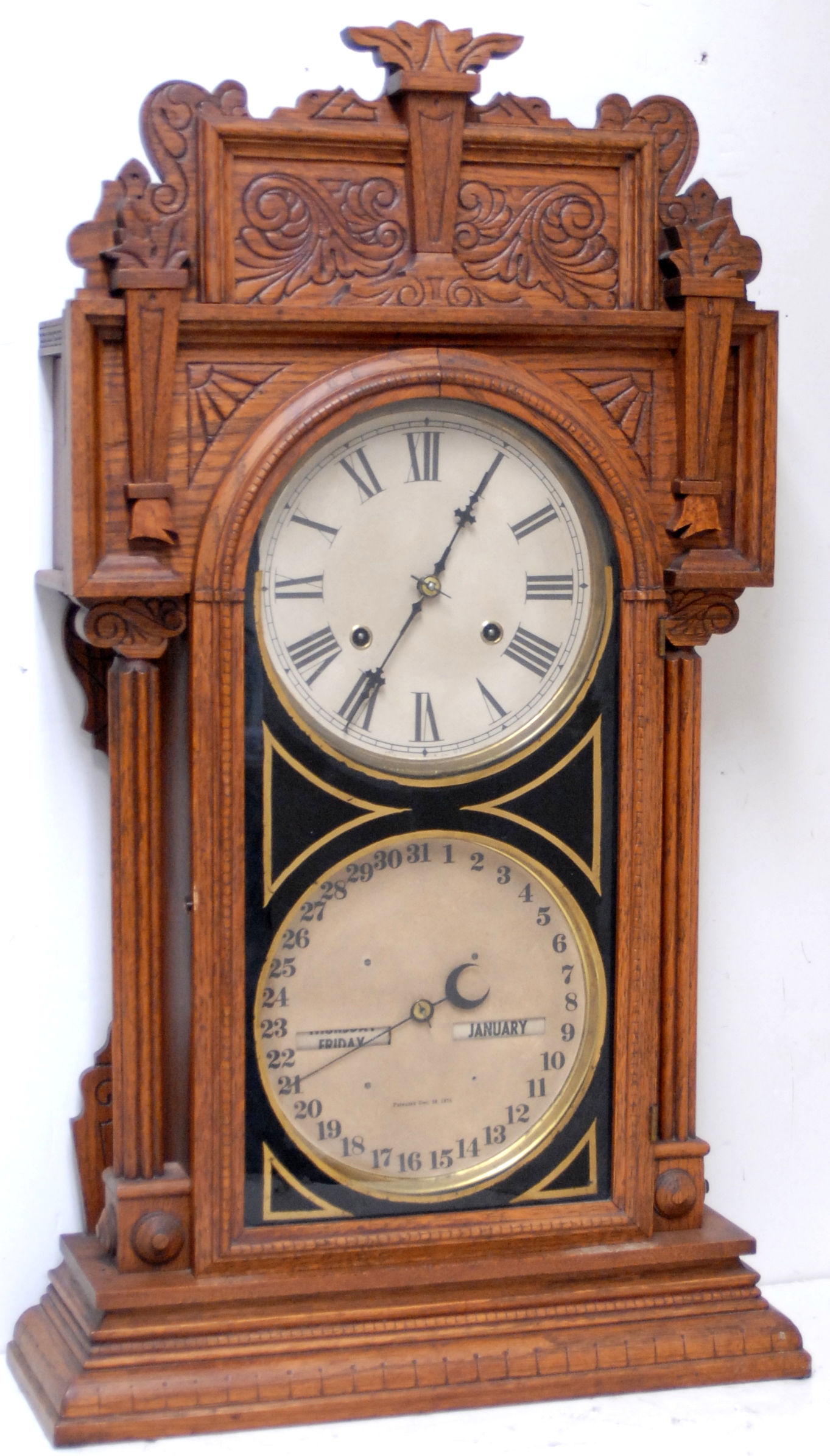 Waterbury Clock Company “Calendar No. 43”, ca 1912. The oak case is 28” high, has the original finish, all original wood parts, and appears to have been partially cleaned yet is not smoky. Both dials are paper replacements. Running movement is 8-day with strike and it is running properly and calendar functioning correctly. Glass paint is original, very minor flaking or thin when viewed from the back side. In addition to being a calendar clock, it is a striking model. Two labels on the back, mostly there, old pendulum bob, a winding key. This is a nice example of this model. Ly-Waterbury #238. $650-$900.