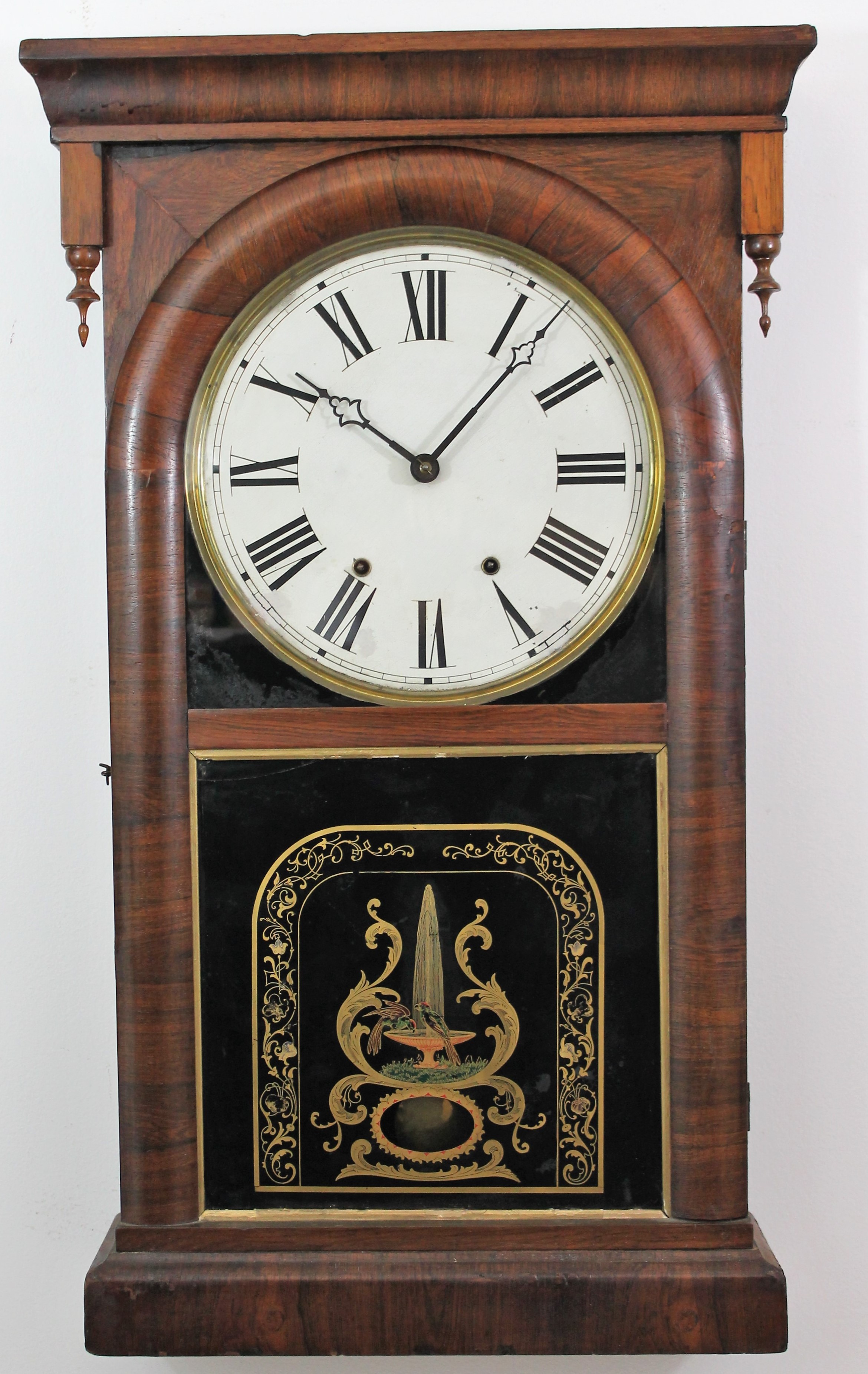 clock with an attention-grabbing tablet of two parrots in a fountain. The rosewood-veneered case is in good original condition