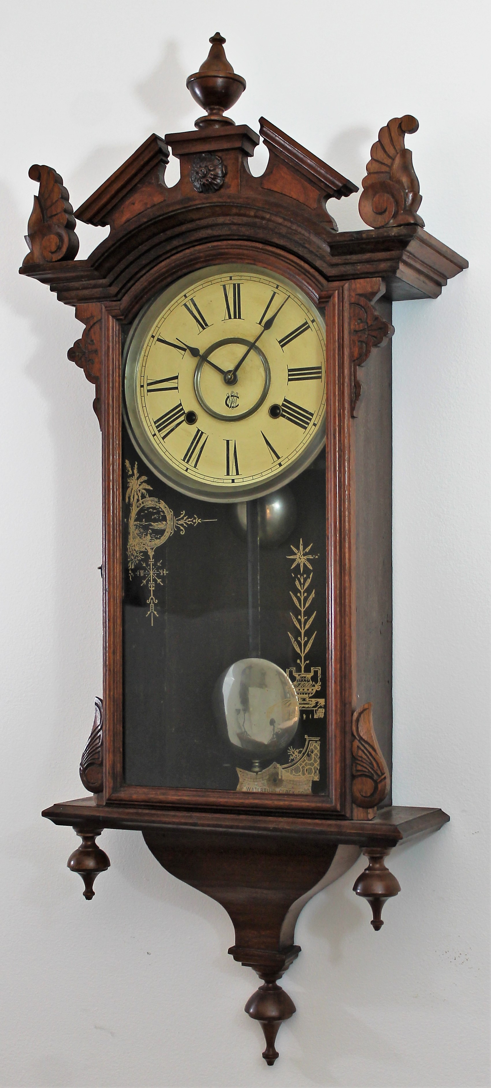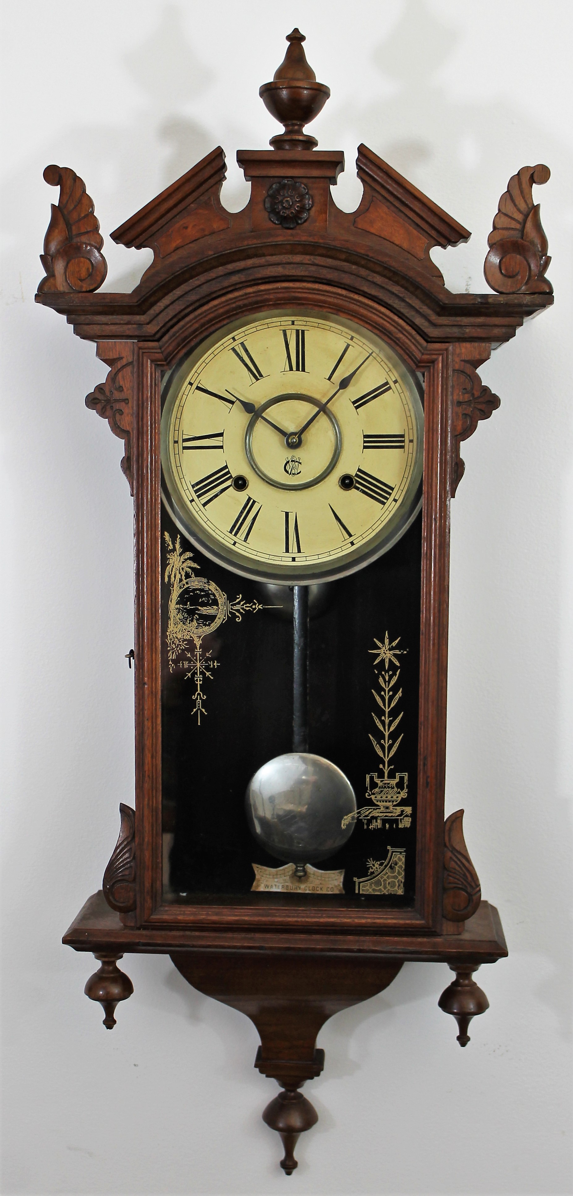 wall clocks, at 37.5 inches from finial tip to finial tip, in a walnut case with a rich finish. The glass is old but the decoration