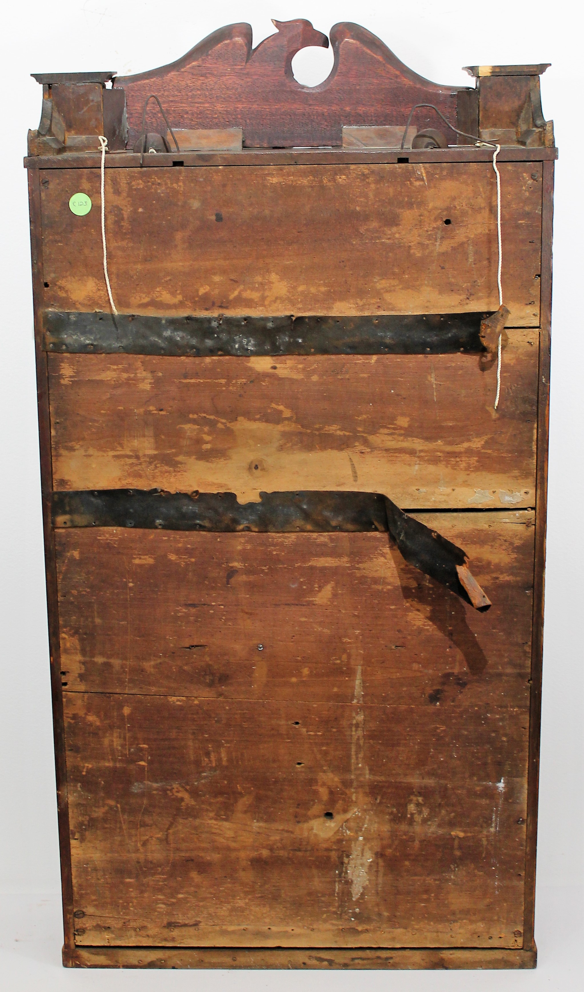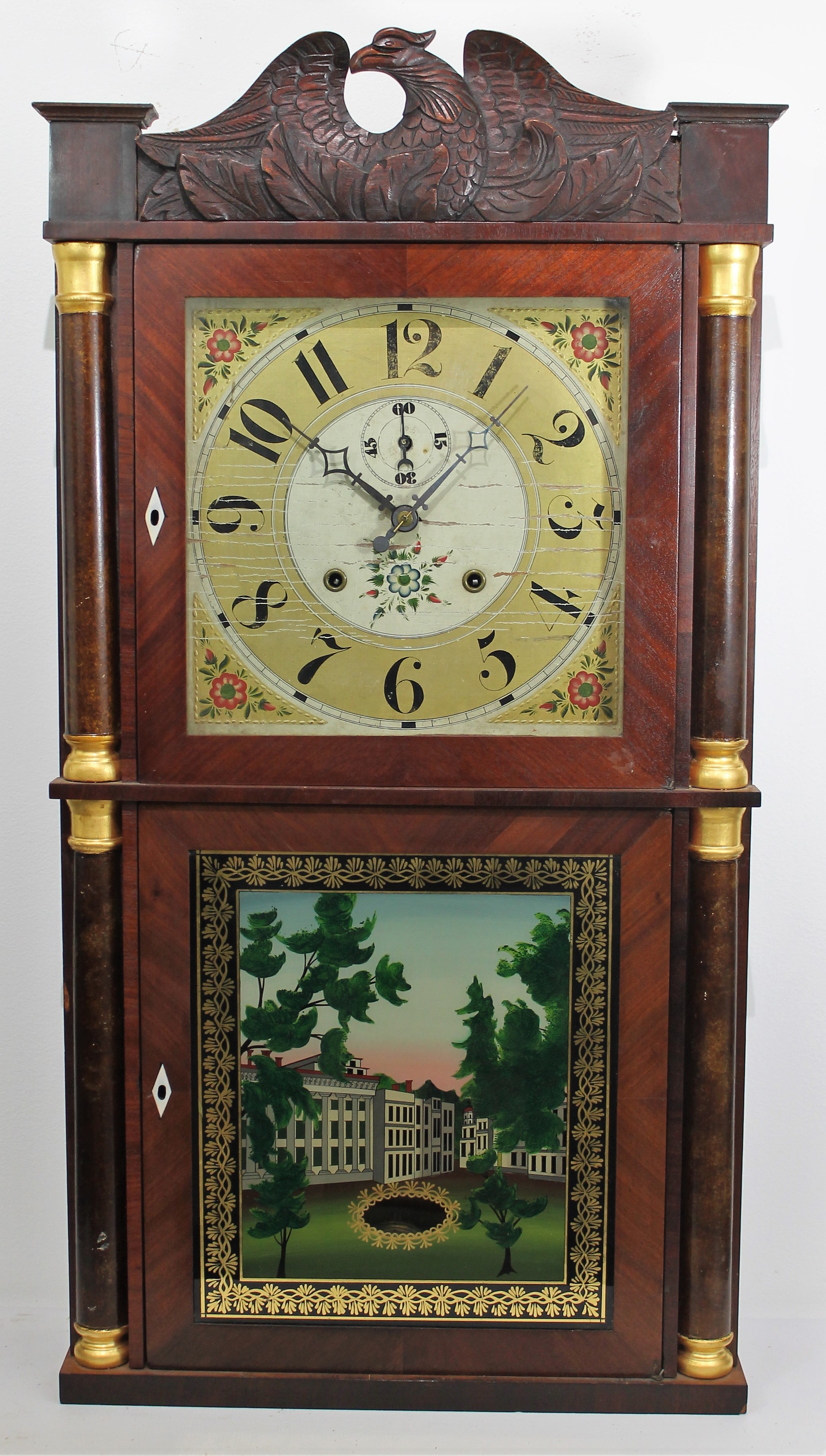 Seymour, Williams & Porter 8-day clock, 1832-1839. These three worked out of Farmington, CT. This two-door case is 35 inches tall with good mahogany veneer all-around. This clock has had some restoration: the carved eagle
