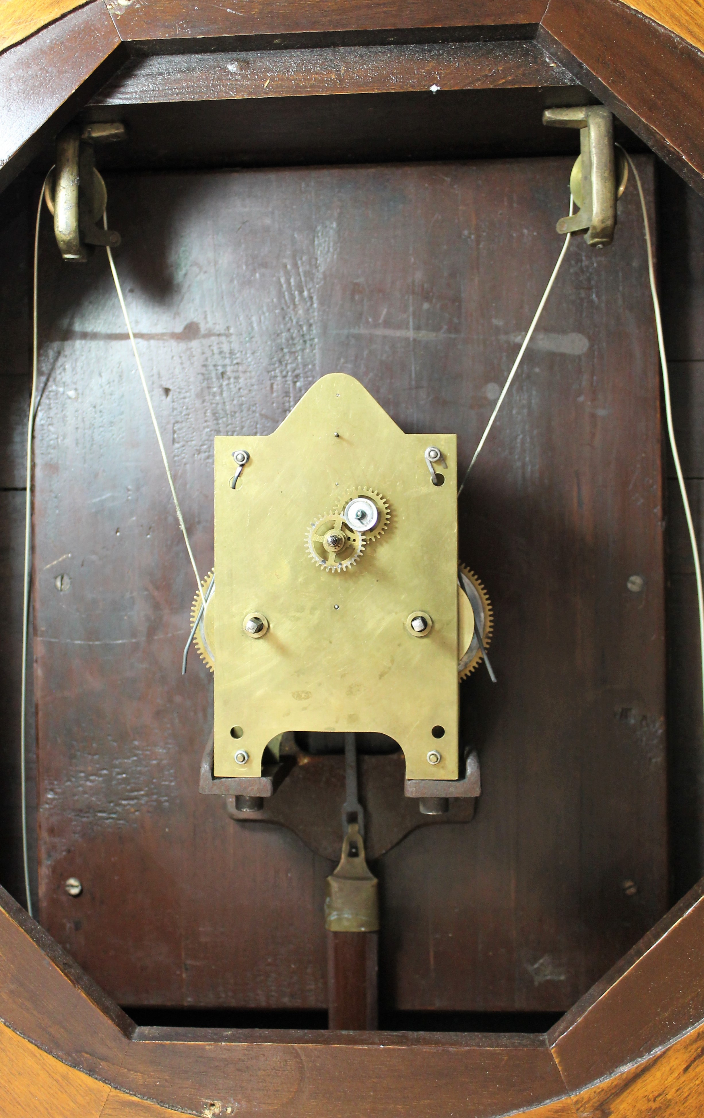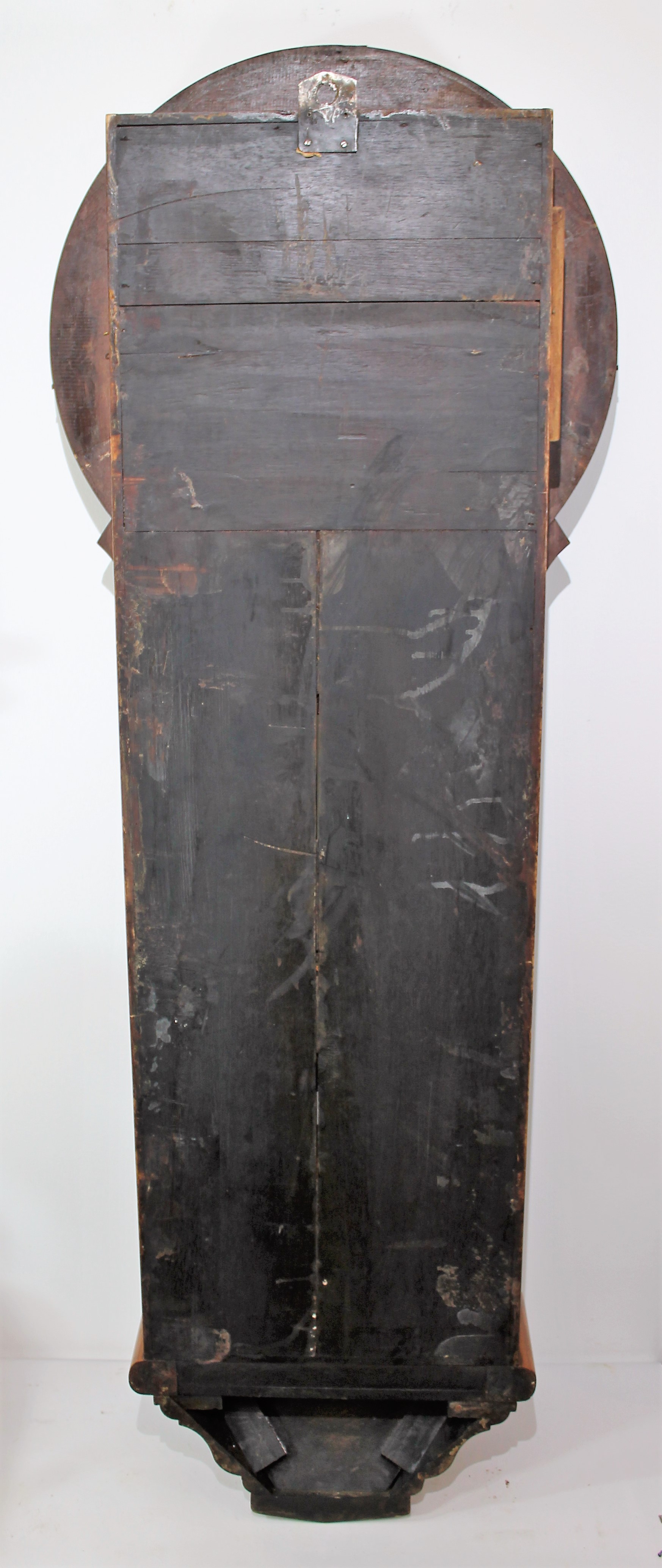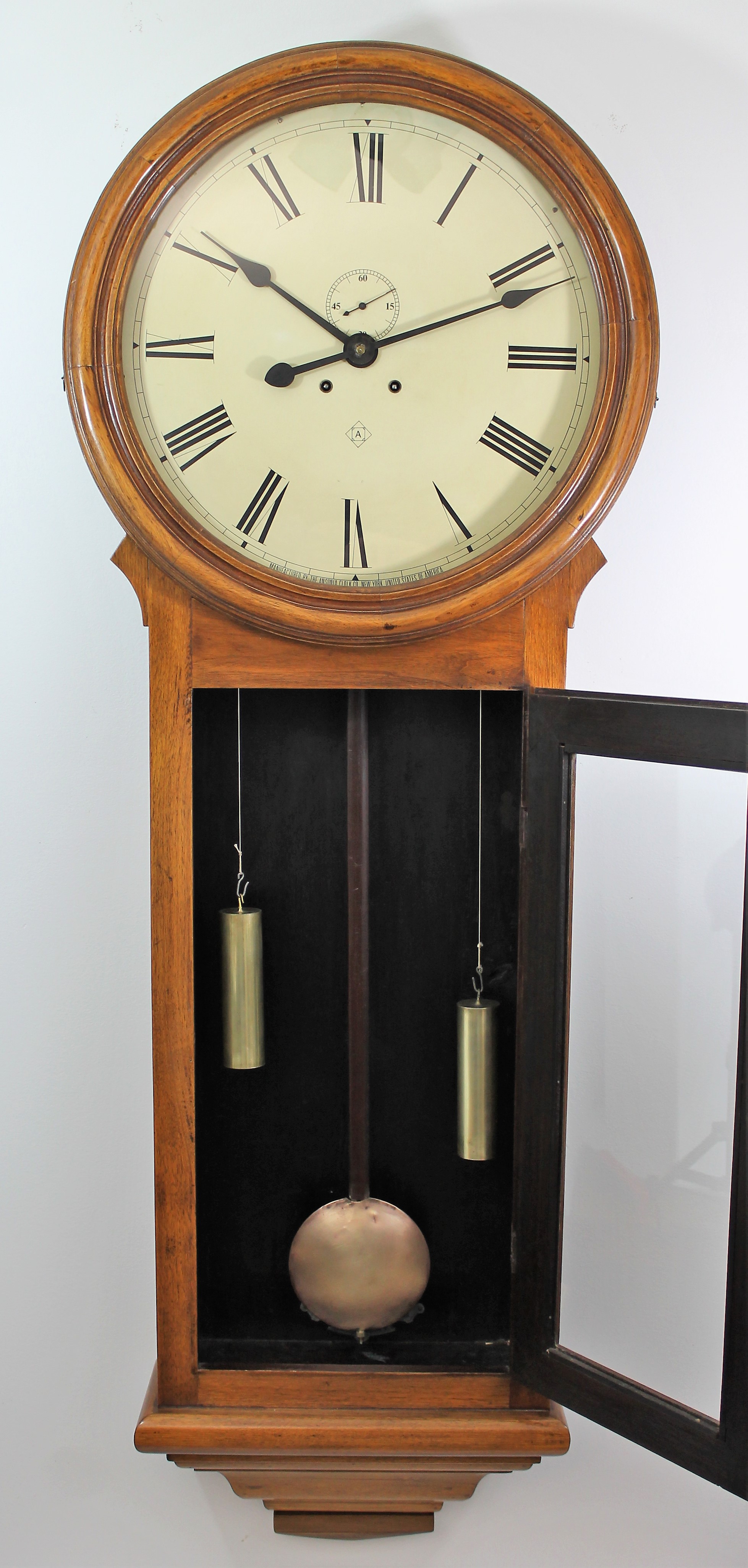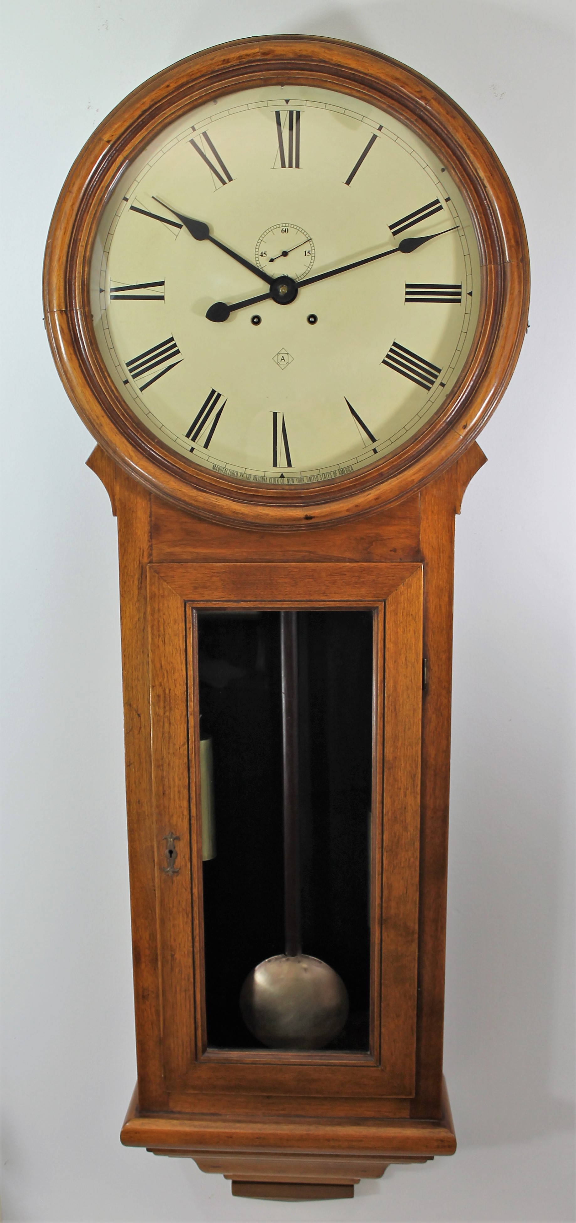 Ansonia “Colonel”, ca. 1914. A 61-inch time-only, weight-driven clock with an 18-inch dial, in refinished black walnut with a rather light finish. The door glass is old, the dial glass new. The dial has been repainted, the hands are correct. The case style and door framing differ slightly from the catalog drawing and may be year-to-year variation. I believe the bottom of the base has been replaced. The pendulum bob has been polished to death; the brass weights are fine. The unsigned movement is running and keeping time. I can’t exclude the possibility that this is a newer case with some original parts, such as the dial, hands, and upper weight pulley assemblies; I can only find one previous sale, in 2003 for $4800, so there isn’t much to compare to. An impressive and uncommon clock. $1000-$1500.