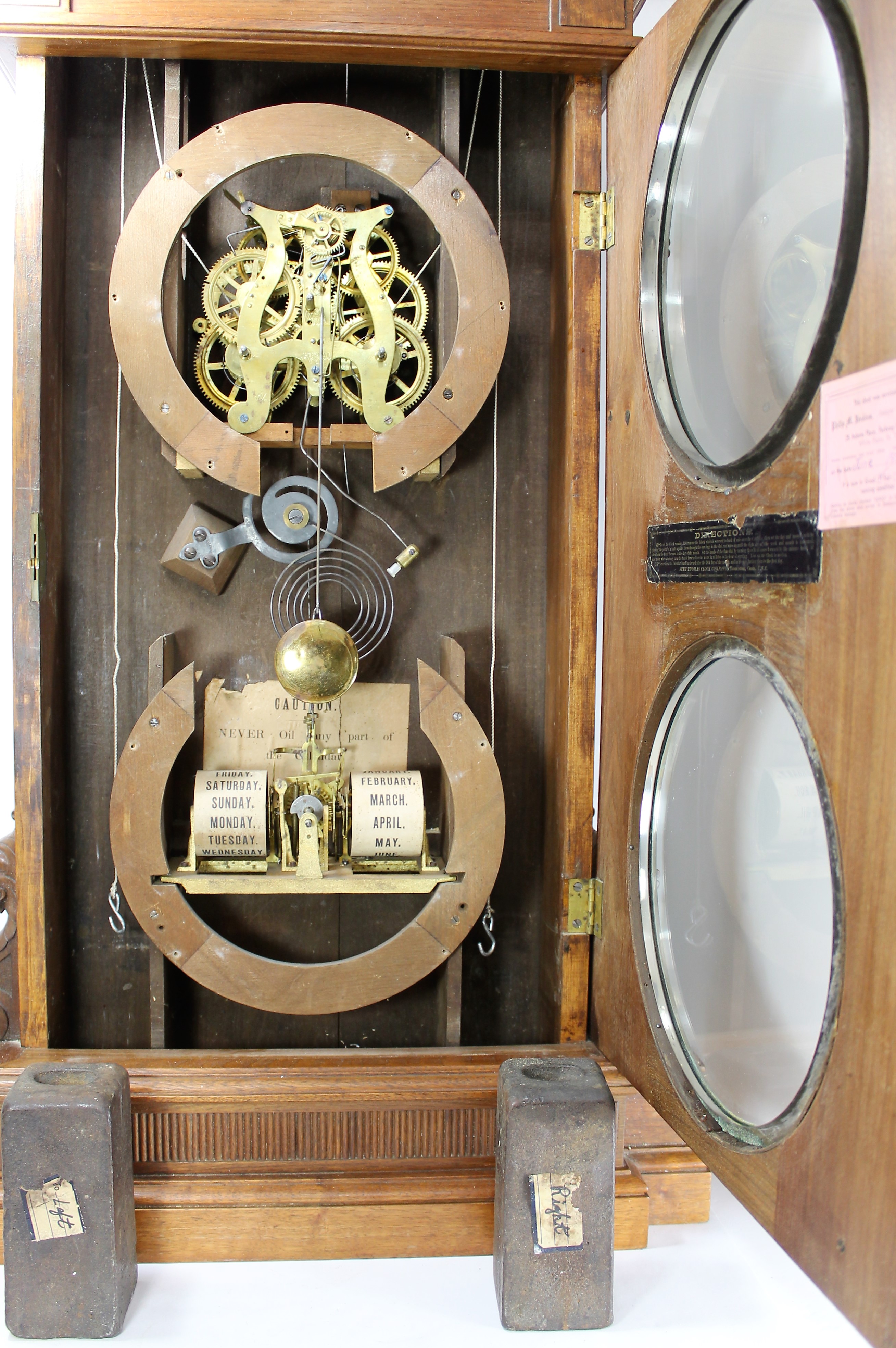 large iron weights included; the calendar roller papers have been replaced. Not a common calendar clock; Fontaine’s sold one