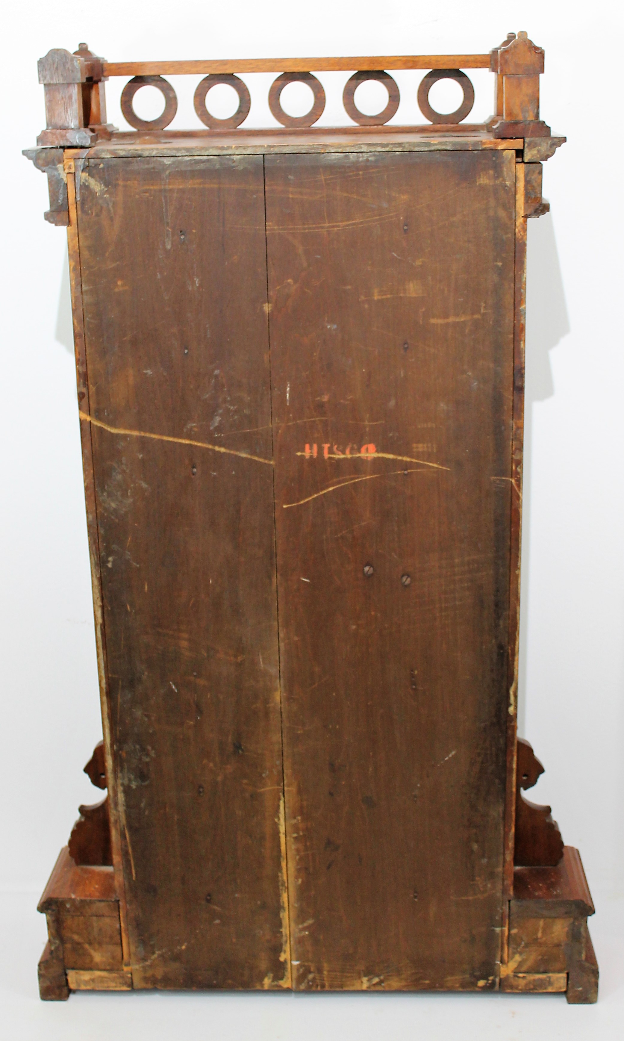 at the top. It stands 36-inches tall in a refinished walnut case with burl trim and elaborate carvings. The trim pieces