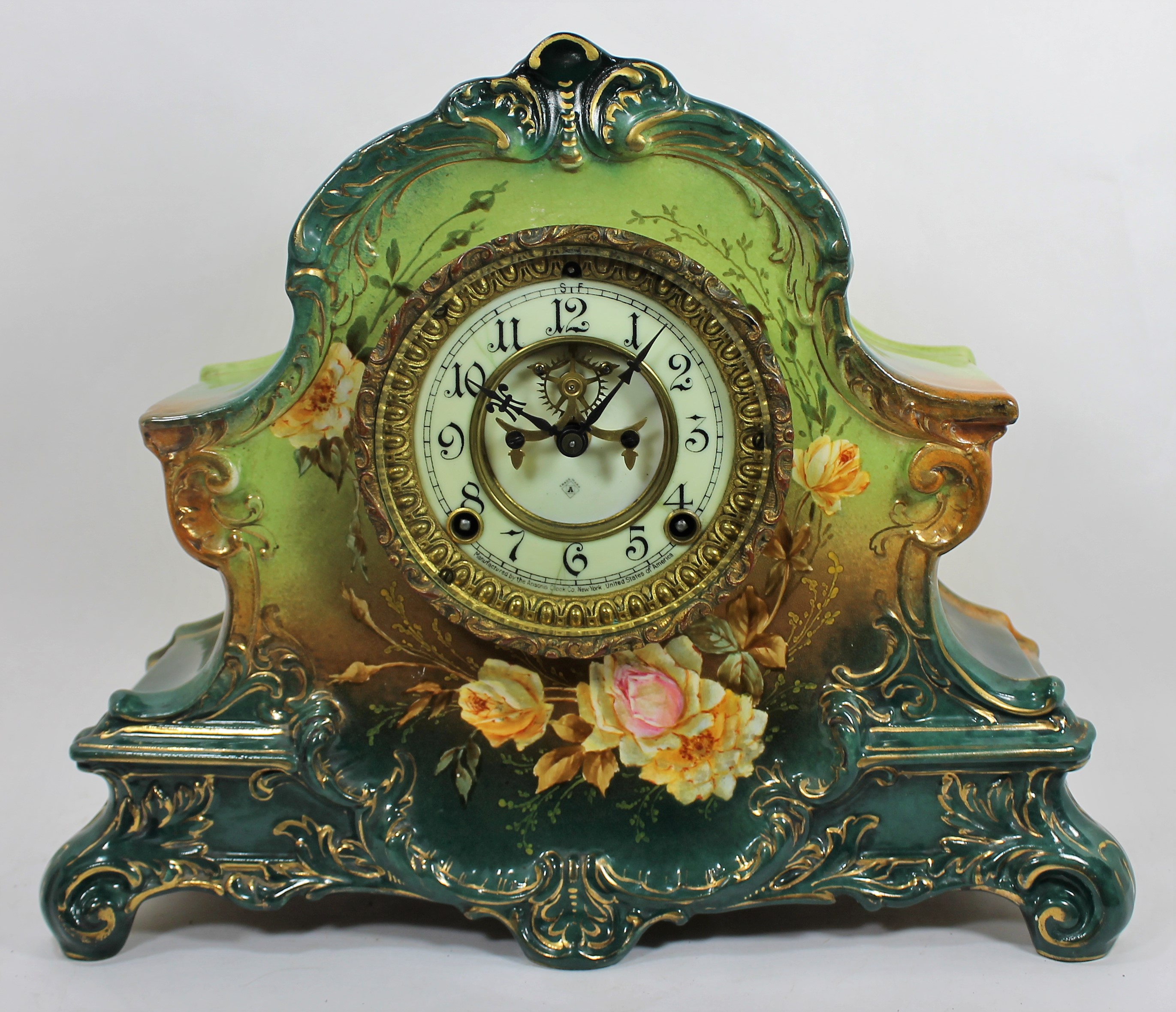 or loss of gold highlighting. The porcelain dial shows two hairlines between the 10 and 11. The Ansonia movement is running,
