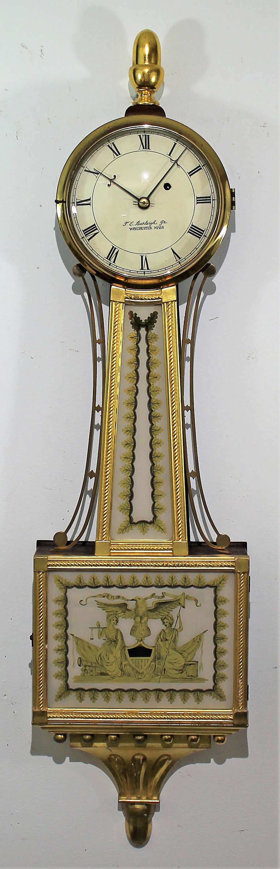 style of Willard presentation banjos from the early 1800’s. Gilded gesso on the beaded front, base and acorn finial. There