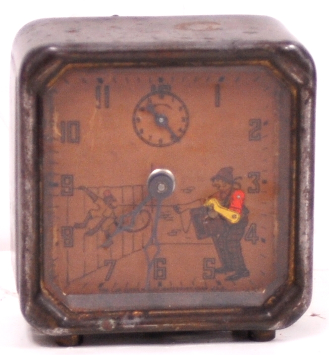 Lux Clock Mfg. Co. “Organ Grinder” alarm clock. Case is aged,