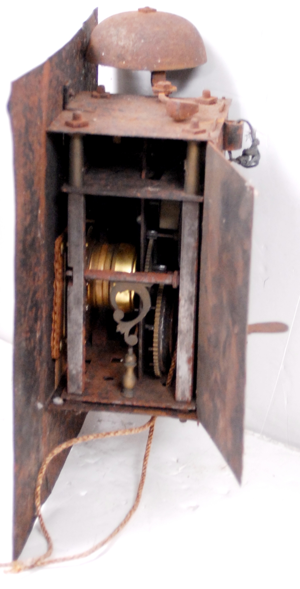Early cow tail clock, crown wheel escapement with short pendulum