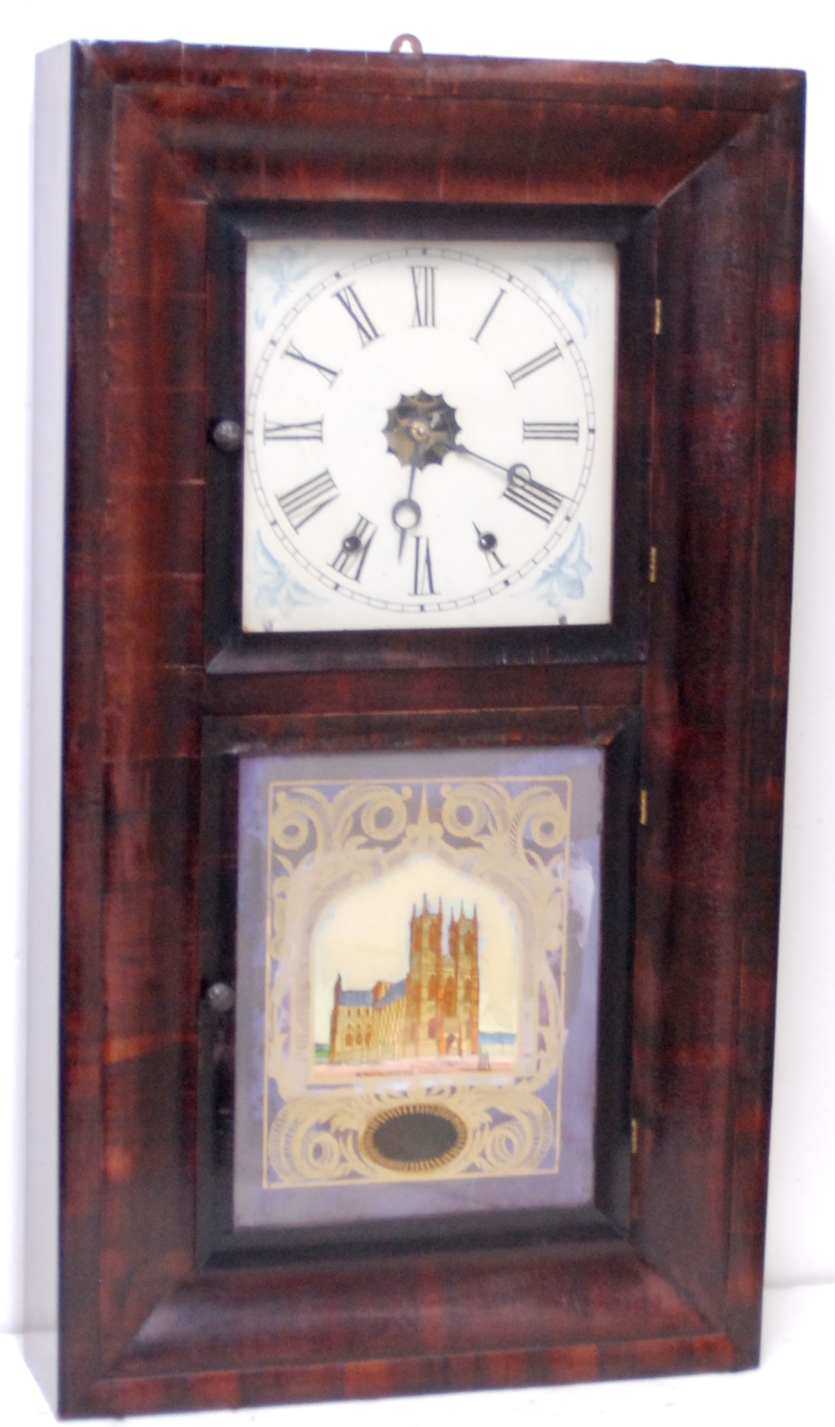 in a two-door ogee case, ca 1843. Mahogany veneered case is 30” tall, and the veneer is good all over. I see one small chip no doubt