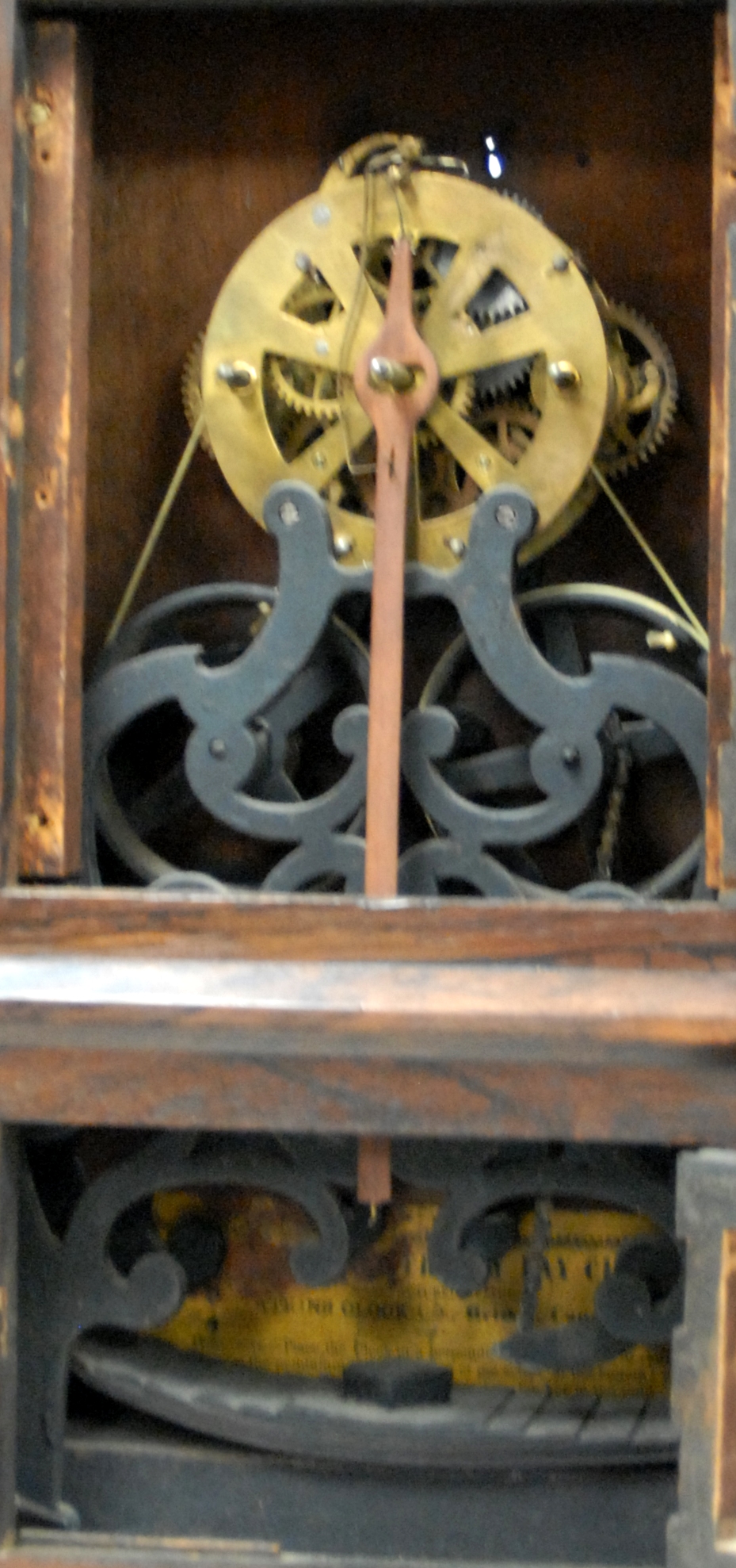 on a coil gong. The calendar mechanism on the back of the lower door has a complete label indicating it was made by B. B. Lewis. Normally