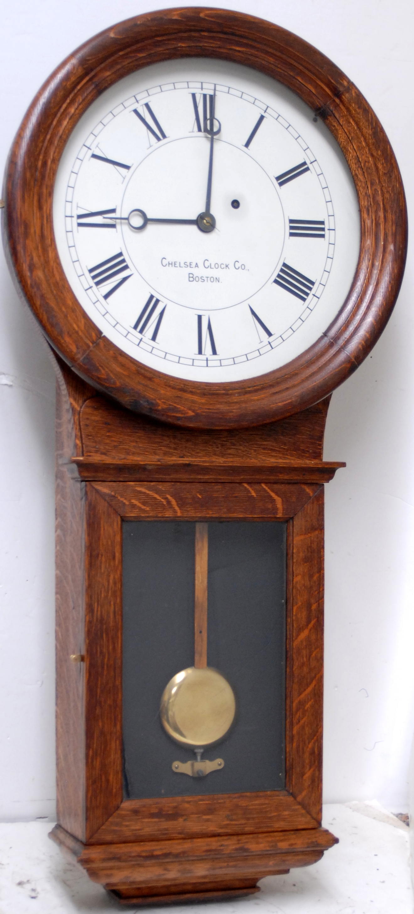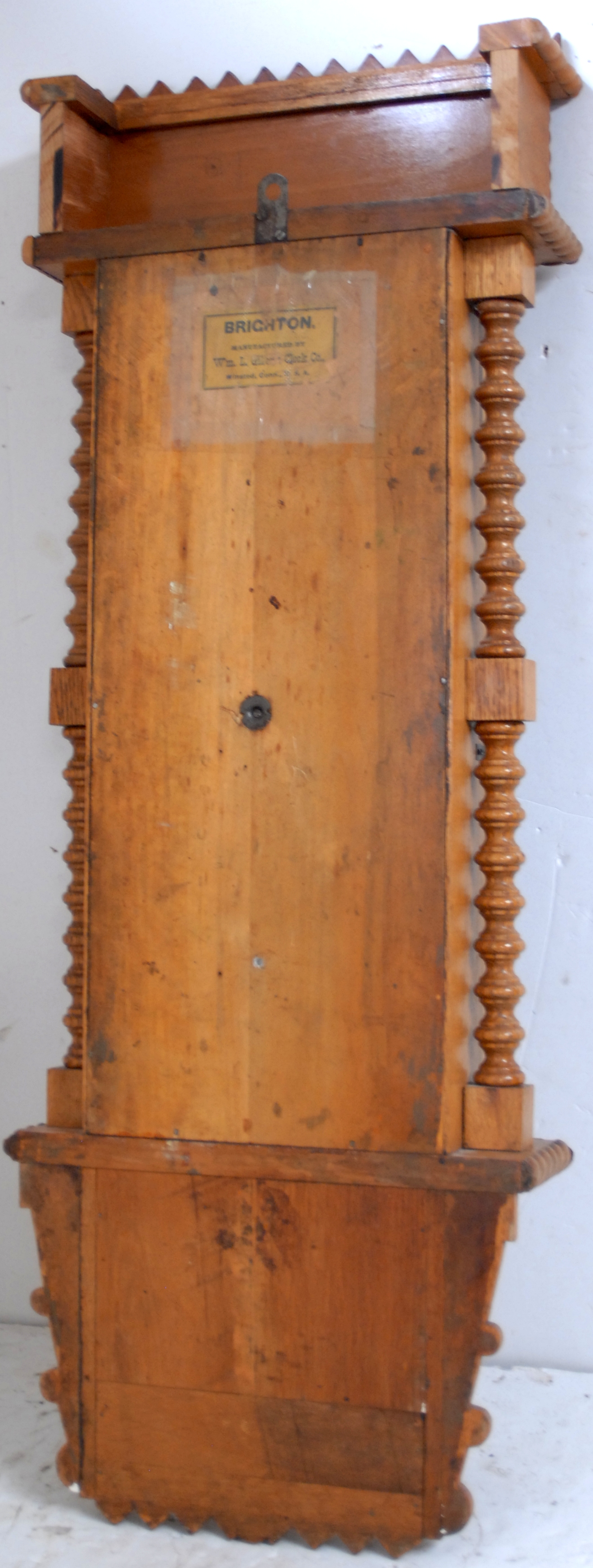 Gilbert Clock Company, hanging clock, Brighton”, ca 1901. This clock is almost mint perfect, and one would swear it had never hung on a wall but was in a box under the bed for 120 years. As you can see the label is complete, the dial, gong, and pendulum are correct and perfect and the oak case looks like it just came from the factory. It is38 inches tall, has and 8-day time and strike movement that is operating perfectly, and I quit, what else can I say. Ly-Gilbert #392. $300-$500.
