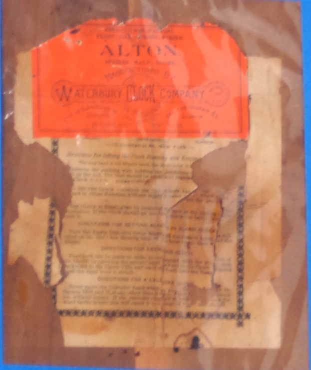 Waterbury Clock Company hanging clock, “Alton”, ca 1906. Walnut case is clean but covered with an old crazed finish and the appearance of a coat of shellac on the wood that has never been touched. The case is almost 40” tall, has ripple molding all around the door frame, applied carvings or pressed trim pieces on the top and base, grooved decorations around the sides. Two partial labels on the back, a complete black label inside, and a correct brass pendulum bob. It is a Waterbury trademark bob with circle in the center, also has a signed beat scale, signed original dial, winding key, correct gong and gong base, and a good old glass in the door. The 8-day movement is signed and is running and striking correctly. There are no extra holes around the movement or dial pan. This is a good original, straight clock. Ly-Waterbury #602. $300-$500.