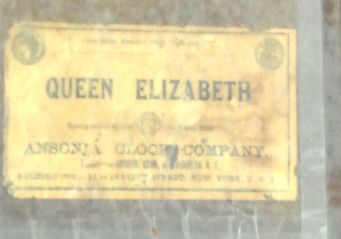 Ansonia Clock Co. hanging clock, “Queen Elizabeth”, ca 1901. The oak case is 37” high, has been restored by cleaning and polishing the original finish, not stripped. It has the original paper dial on the old pan, all the brass was polished, movement cleaned and serviced, so that now it is ready to hang and enjoy. I cannot find and flaws on the wood case but surely there is a small nick somewhere. We believe all the finials and other wood parts are original to the case although after cleaning some of the wood parts are different shades. They are still original, all wood parts are not the same shade on any clock. The door glass, pendulum bob, pendulum stick, and the hands, are probably original to the clock. On the back is a paper label, about 95% still intact. Ly-Ansonia #620. $250-$500.