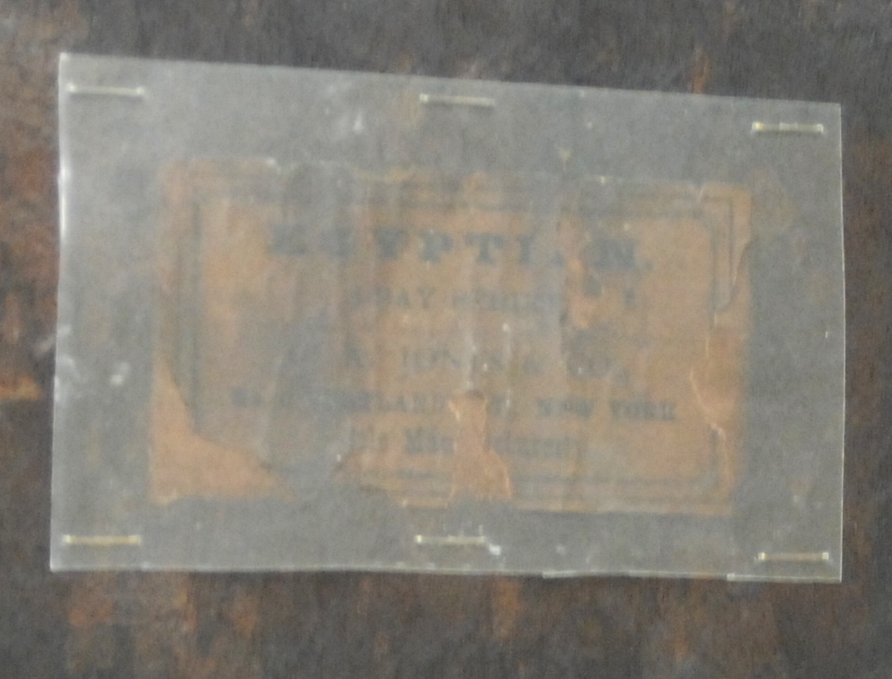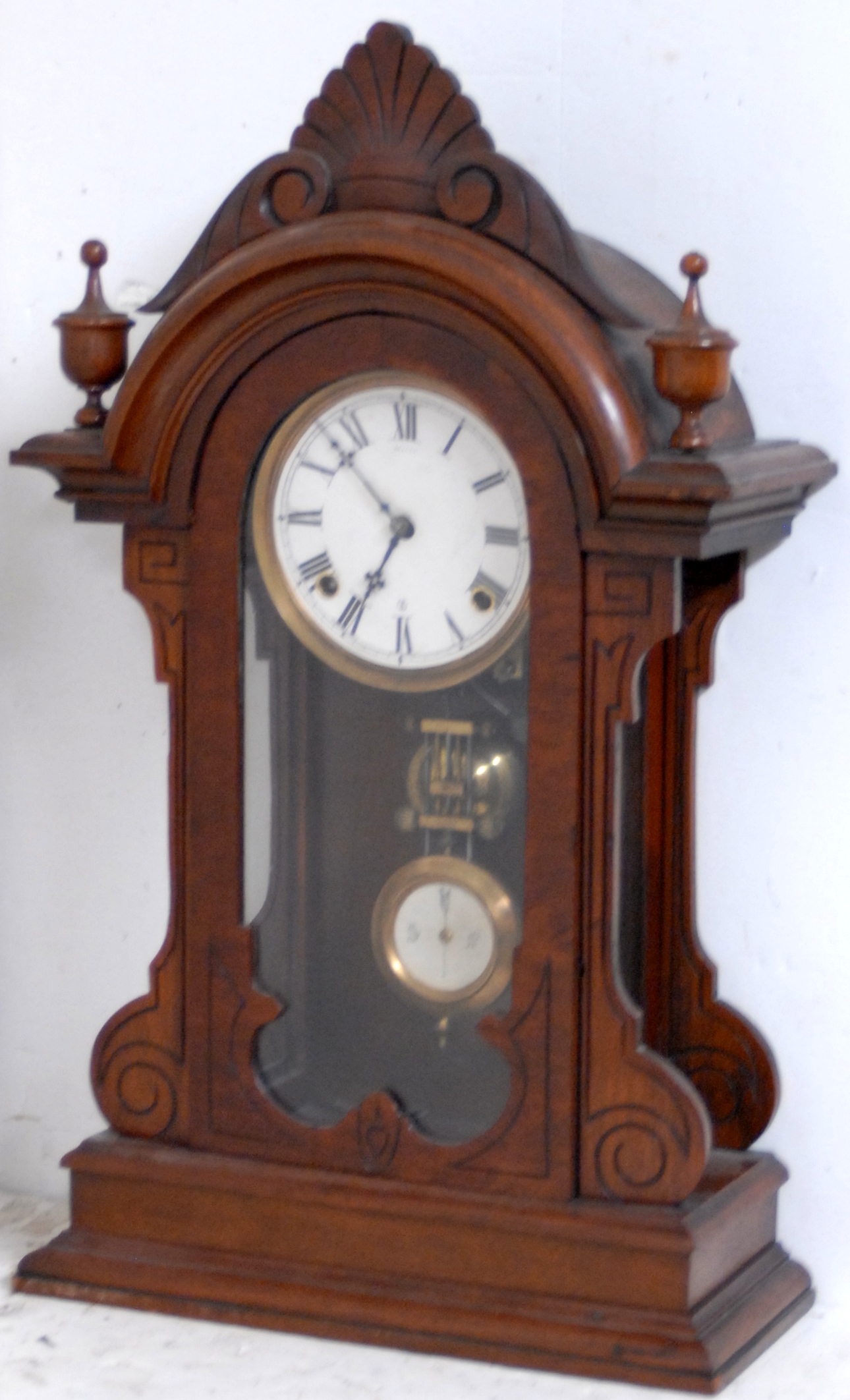 “G. A. Jones & Co. New York”, 8-day mantel clock, “Egyptian”, in a large and attractive case, ca 1870-1874. This clock reminds me of several Ansonia clocks produced after 1877 when Ansonia was reorganized and Henry J. Davies became General Manager. Davies had bought out George Jones in 1874. In other words, Davies continued making the Jones models when he was in business for himself and also when he ran Ansonia. I am surprised Ansonia did not name a clock Egyptian. This walnut case is 24 ½ inches tall, the four clock sides are identical, it has 3 glasses, finials, and ornate top and a fancy pendulum that Jones was noted for. The paper dial is a replacement, and the clock deserves a nice painted dial. The 8-day movement is running and striking a bell on the hours. On the back is a complete paper label. $400-$600.