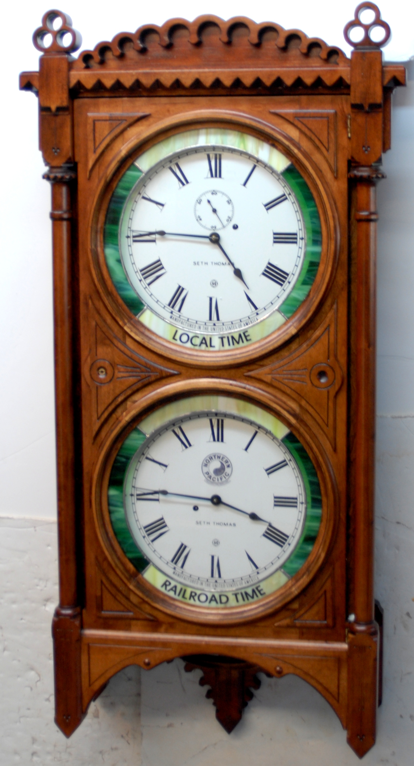 This reproduction No. 5 was transformed into a railroad clock with two time dials, new trim around to the outer rims of both glasses,