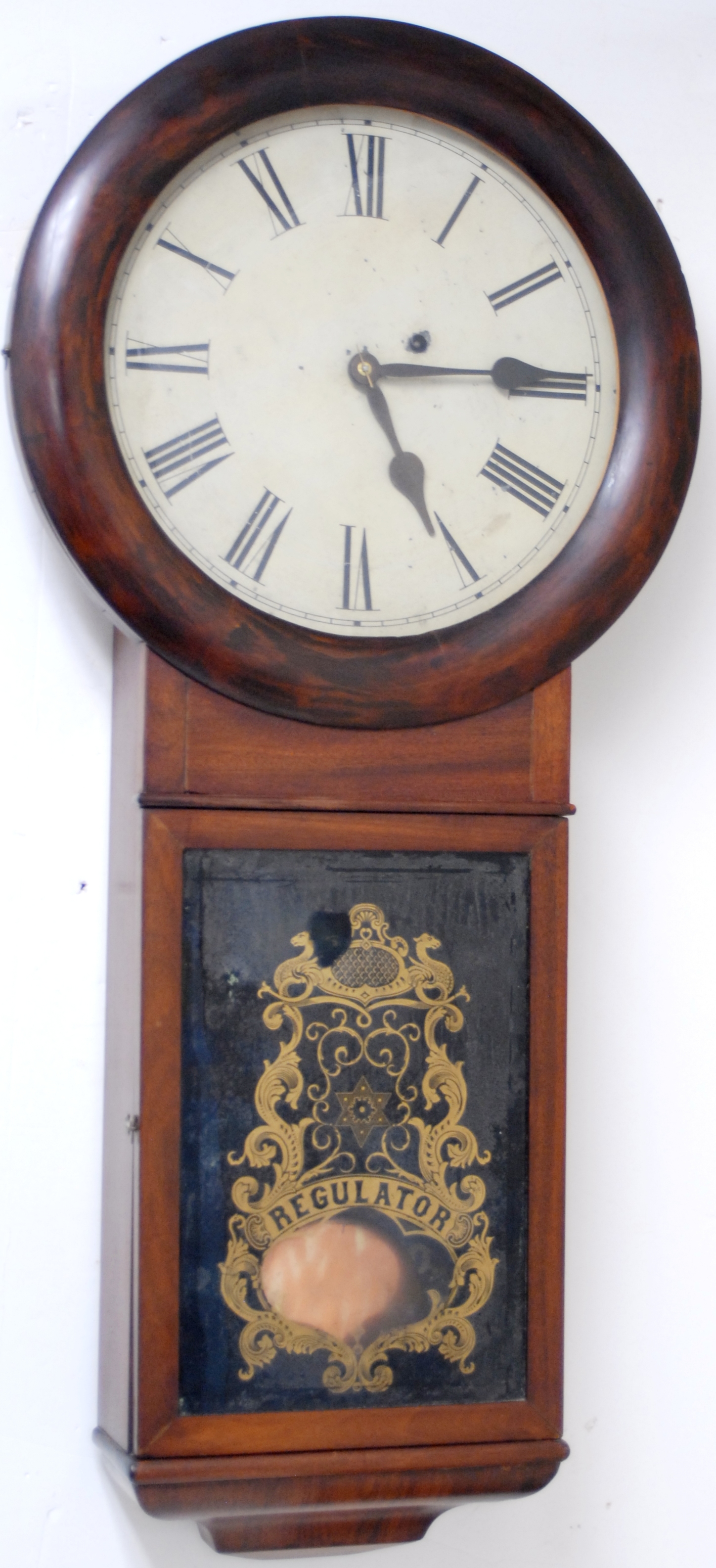 Seth Thomas Clock Co. “Regulator No. 1”, ca 1860-1865. Complete black and gold label covering the weight chute panel, says in part, “Manufactured by Seth Thomas Clock Co. Thomaston, Conn.”. Rosewood veneered case is 34” high, has good veneer all over but undoubtedly has a nick or two somewhere. I see no real problems with the clock. The hands, glasses, weight, pendulum ball and stick, all appear to be original. Someone has polished the brass pendulum ball until it is mostly a copper color. You can have brass put back on them if you choose. The paper beat scale in the base, separate from the label, if there was one it is pretty well wiped out. Both doors lock with a hook on the side. The movement is the early type, rectangular, and the weight drops down the center of the case behind the sliding label board, like the later No. 2 regulators. This nice very early clock is running, and is very good looking. Ly-Seth Thomas, pages 269-271. $1000-$1500.