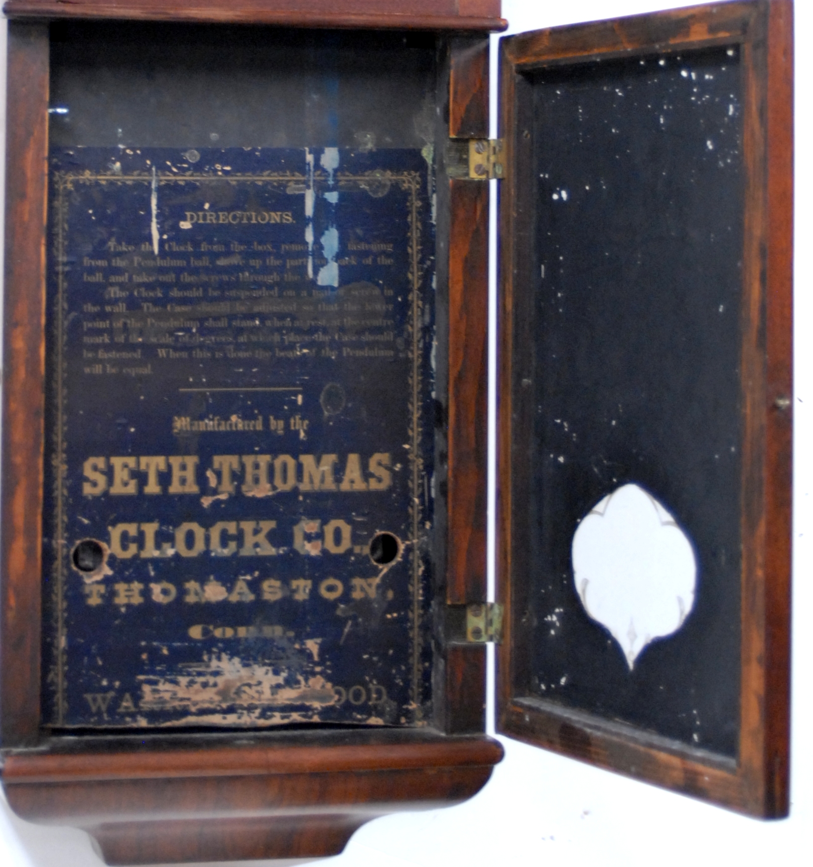 Thomas Clock Company, Thomaston, Conn.”. The time only movement is 8-day, powered by one wafer weight that descends a weight chute